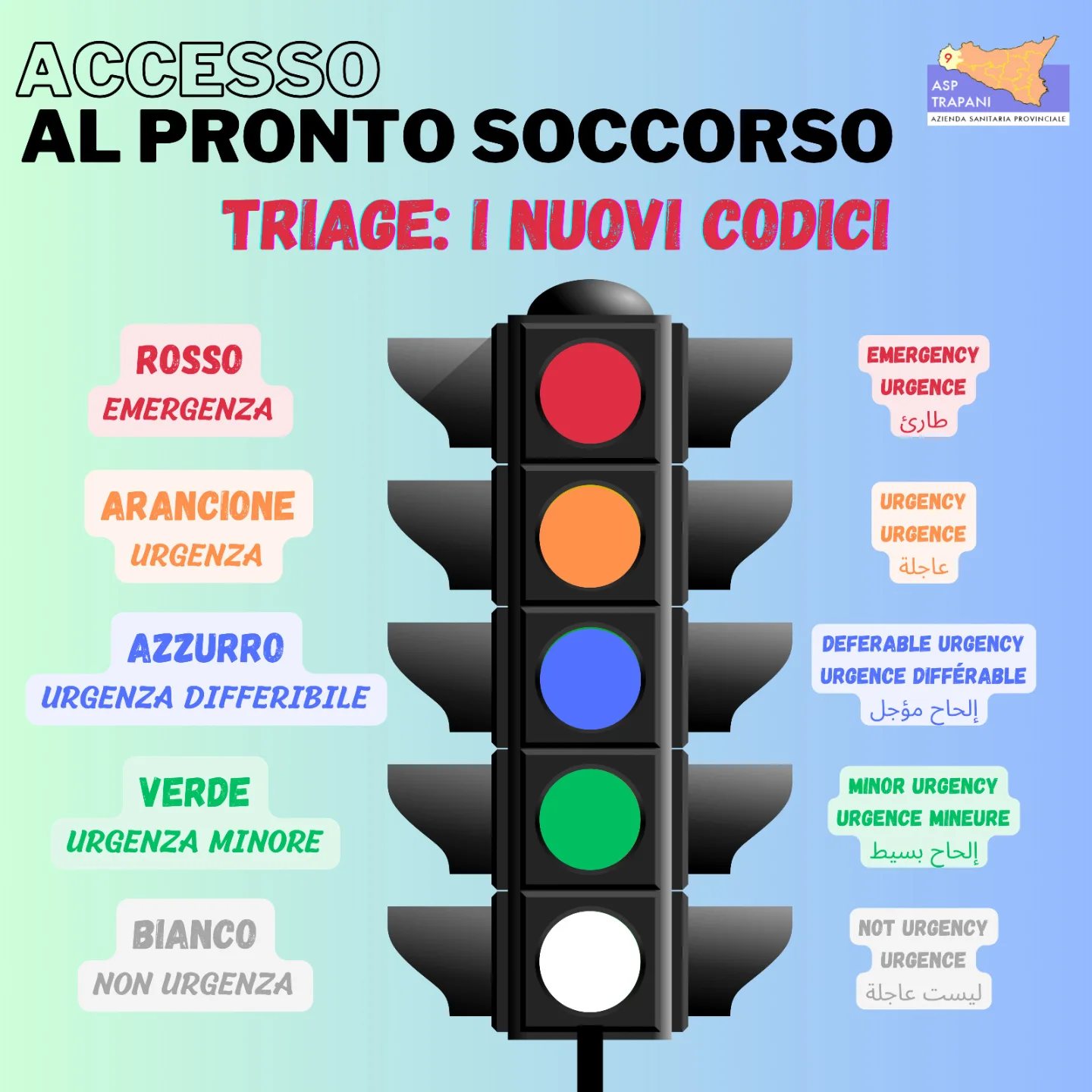 Si passa così, da 4 a 5 colori, a cui corrisponde un diverso grado di urgenza: si cancella il codice Giallo e nascono l’Arancione e l’Azzurro.